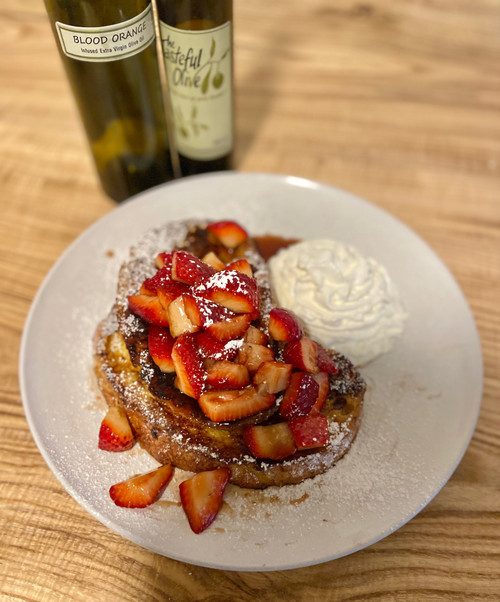 Blood Orange French Toast With Balsamic Strawberries Ingredients: 3 large eggs 1 c. milk 2 T. sugar 1/4 c. The Tasteful Olive Blood Orange infused extra virgin olive oil 2 t. cinnamon 1 t. vanilla extract 7-10 thick slices of bread The Tasteful Olive Butter infused extra virgin olive oil, for cooking Toppings: pint of strawberries, stems removed and quartered 3 T. Strawberry Balsamic 2 T. Chocolate Balsamic Honey, to taste Whipped cream Powdered sugar In a shallow bowl whisk together the eggs, milk, sugar, oil, cinnamon, and vanilla. Dunk the bread in the mixture and soak both sides. Meanwhile, warm up a skillet over medium heat, and add some butter olive oil. Transfer the bread to the skillet and cook until golden. Turn and cook the opposite side until golden. Toss the strawberries with the balsamic vinegars. Serve the French toast with the balsamic strawberries, honey, whipped cream, and powdered sugar. |